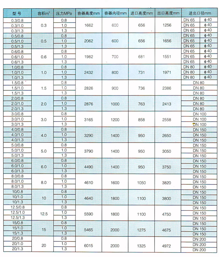 有立式與臥式兩種,儲存介質(zhì)有氣體、液體、固體。 適用范圍:醫(yī)藥、化工、食品、飲料行業(yè)。 技術(shù)參數(shù): 設(shè)計(jì)壓力范圍: 0.9~1.4MPa 設(shè)計(jì)溫度范圍: ≦150℃ 容 積 :0.3~20m3 連 接 方 式 :法蘭連接 標(biāo) 準(zhǔn) 配 置 :壓力表、安全閥、排污閥、配對法蘭 安 裝 場 地 :需基地,離墻面80公分距離 規(guī)格型號: